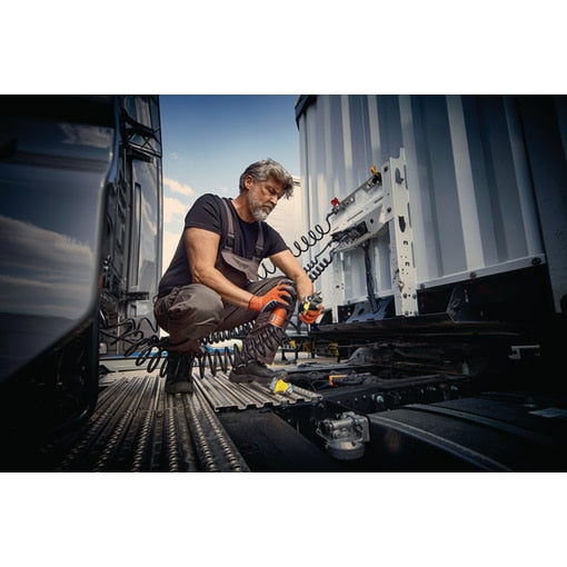 - Zárószeleppel, megfelel a DIN 74254-nek (a szelep lecsatlakozásnál zár és így nem távozik el a levegő)