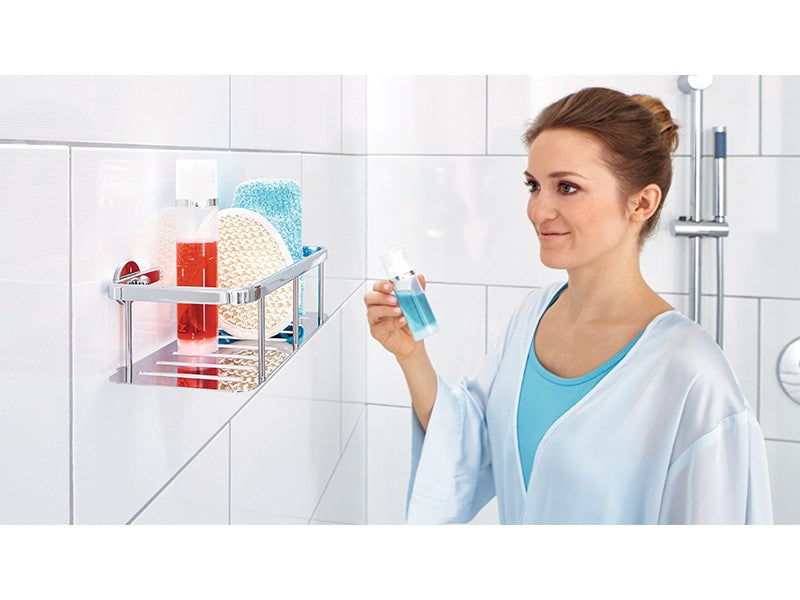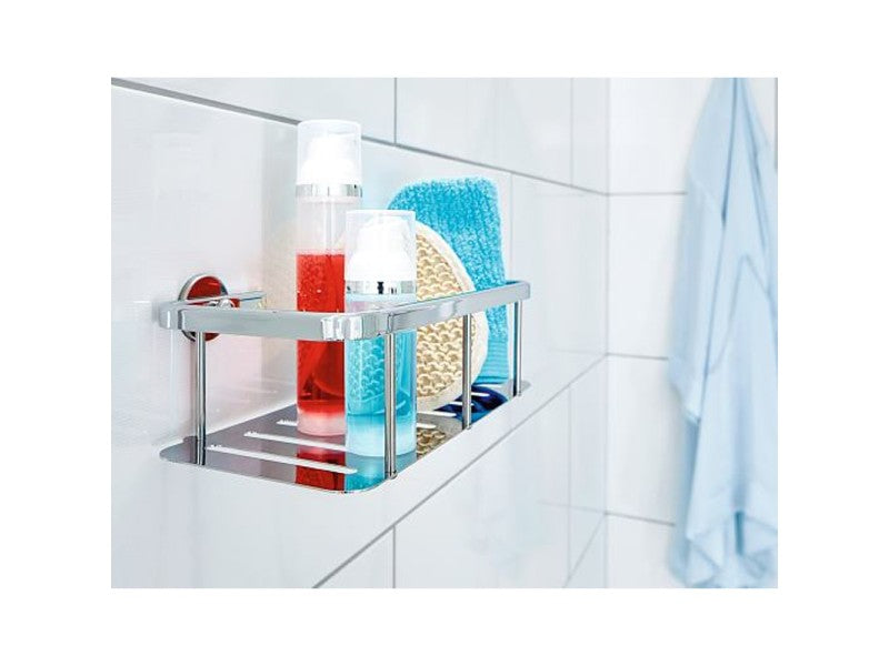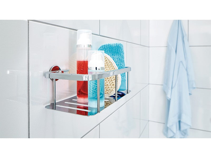 A tesa® ALUXX zuhanypolc ideális megoldás a tusfürdők és más kellékek tárolására egyetlen, könnyen elérhető helyen. Fényes krómozott alumínium testével és gyönyörű formájával csodálatos kiegészítő zuhanyzójában. Ráadásul alsó lemezének köszönhetően a piperecikkek stabilan állnak és nem borulhatnak fel. A ragasztós rögzítési megoldásnak köszönhetően, melynek 12 órára van szüksége a kötéshez, a kosár tetszés szerint bárhová felhelyezhető. Nincs szükség fúrásra, így a csempék épek maradnak. A zuhanypolc bármikor nyom nélkül le is vehető, és egy új BK43-2 adapterrel máshol újra felhasználható.