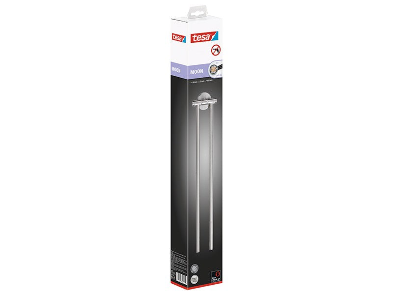 A falra szerelhető tesa® MOON kétkaros öntapadós törölközőtartó rozsdamentes acél hatású, ujjlenyomatmentes megjelenésével bármely fürdőszobába jól illik. Mutatós kiegészítő kihajtható karokkal, amelyeknek köszönhetően könnyen szárítható rajta két tetszőleges méretű törölköző. Könnyen, fúrás nélkül a falra erősíthető, mivel a tesa® Power.Kit ragasztós technológia tökéletes megoldást nyújt a rögzítésre. 12 óra száradás után a tartó stabilan rögzül a falra. Az alatta levő felület érintetlen marad. A tartó bármikor egyszerűen, nyom nélkül eltávolítható, és újra felhasználható egy új BK20-2 adapterrel.
