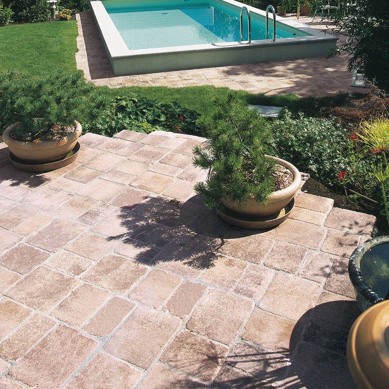 Antikolt hatású, lávavörös, egyenetlenül töredezett, kombi térkő, hullámos élekkel és finoman árnyalt, természetes, enyhén karcolt felülettel, a tradicionális stílus kedvelőinek.