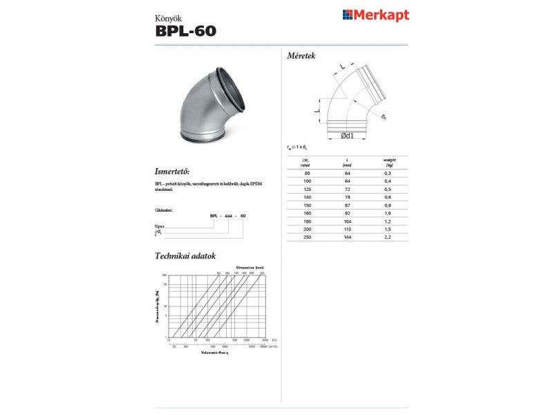 BPL gumis idom (könyök) varrathegesztett, dupla EPDM tömítéssel. Fém flexibilis és merev körcsatornák kiegészítő eleme. Segítségével 60 fokban lehet a szellőző rendszer vezetésének irányát megváltoztatni. A fém könyök idom anyaga: préselt kivitelben, horganyzott acél. A BPL 60 fok könyök idom gumi tömítéssel rendelkezik a megfelelő légtömörség érdekében. A könyök idom szerelése egyszerű, csak a szellőző csővel össze kell toldani, majd ALUTAPE szalaggal rögzíteni.