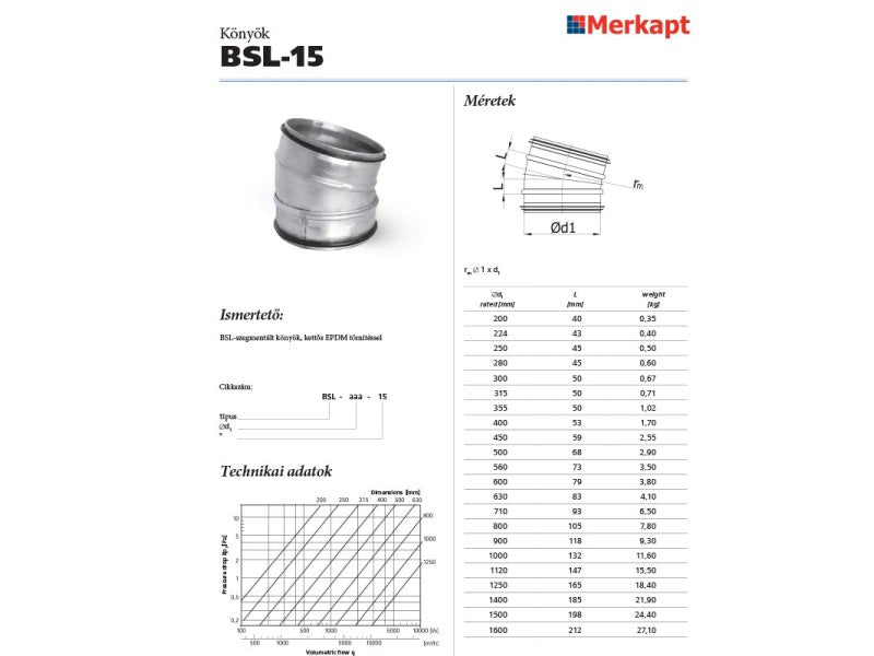 A BSL 15°-os gumis idom varrathegesztett szegmentált, dupla EPDM tömítéssel. Fém flexibilis és merev körcsatornák kiegészítő eleme. Segítségével 15 fokban lehet a szellőző rendszer vezetésének irányát megváltoztatni. A fém könyök idom anyaga: szegmentált kivitelben, horganyzott acél. A BSL 15 fok könyök idom gumi tömítéssel rendelkezik a megfelelő légtömörség érdekében. A könyök idom szerelése egyszerű, csak a szellőző csővel össze kell toldani, majd ALUTAPE szalaggal rögzíteni.