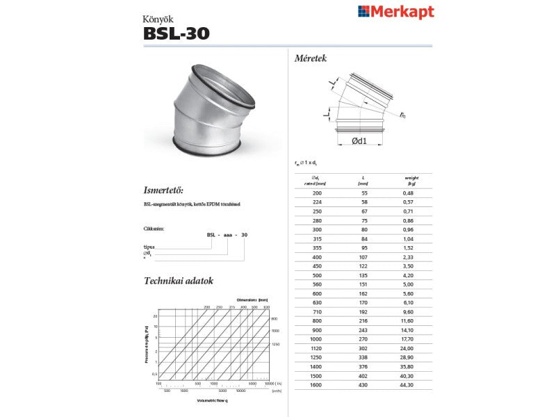 A BSL 30°-os gumis idom varrathegesztett szegmentált, dupla EPDM tömítéssel. Fém flexibilis és merev körcsatornák kiegészítő eleme. Segítségével 30 fokban lehet a szellőző rendszer vezetésének irányát megváltoztatni. A fém könyök idom anyaga: szegmentált kivitelben, horganyzott acél. A BSL 30 fok könyök idom gumi tömítéssel rendelkezik a megfelelő légtömörség érdekében. A könyök idom szerelése egyszerű, csak a szellőző csővel össze kell toldani, majd ALUTAPE szalaggal rögzíteni.