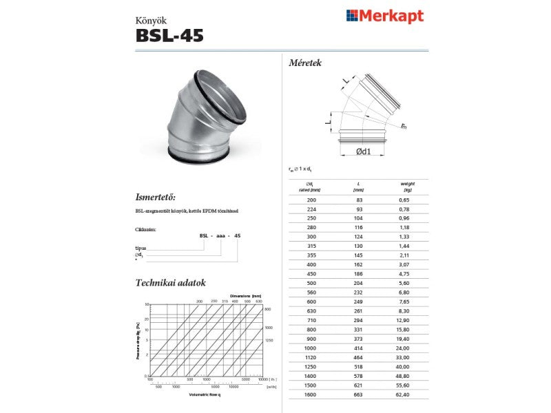 A BSL 45°-os gumis idom varrathegesztett szegmentált, dupla EPDM tömítéssel. Fém flexibilis és merev körcsatornák kiegészítő eleme. Segítségével 45 fokban lehet a szellőző rendszer vezetésének irányát megváltoztatni. A fém könyök idom anyaga: szegmentált kivitelben, horganyzott acél. A BSL 45 fok könyök idom gumi tömítéssel rendelkezik a megfelelő légtömörség érdekében. A könyök idom szerelése egyszerű, csak a szellőző csővel össze kell toldani, majd ALUTAPE szalaggal rögzíteni.