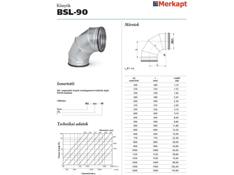 Fém flexibilis és merev körcsatornák kiegészítő eleme. Segítségével 90 fokban lehet a szellőző rendszer vezetésének irányát megváltoztatni. A fém könyök idom anyaga: szegmentált kivitelben, horganyzott acél. A BSL 90 fok könyök idom gumi tömítéssel rendelkezik a megfelelő légtömörség érdekében. A könyök idom szerelése egyszerű, csak a szellőző csővel össze kell toldani, majd ALUTAPE szalaggal rögzíteni.