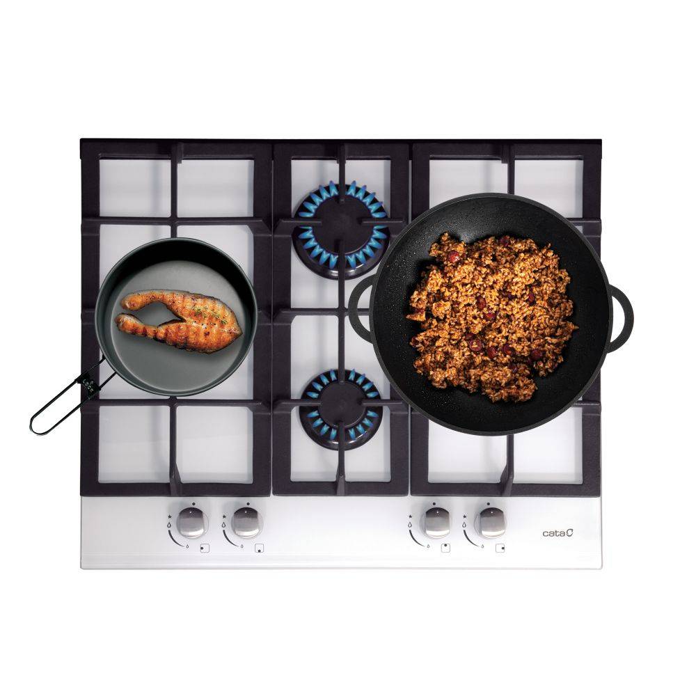 4 gázégő égésbiztosítóval, automata szikragyújtás, fehér üveg felület, öntöttvas rács, teljesítmény: 9,25 kW, 1 db nagy gázégő - 3 kW, 1 db közepes gázégő - 1,75 kW, 1 db tripla koronás WOK égő - 3,5 kW, 1 db normál égő - 1 kW, tartozék: LPG (palackos) gázhoz a fúvókakészlet