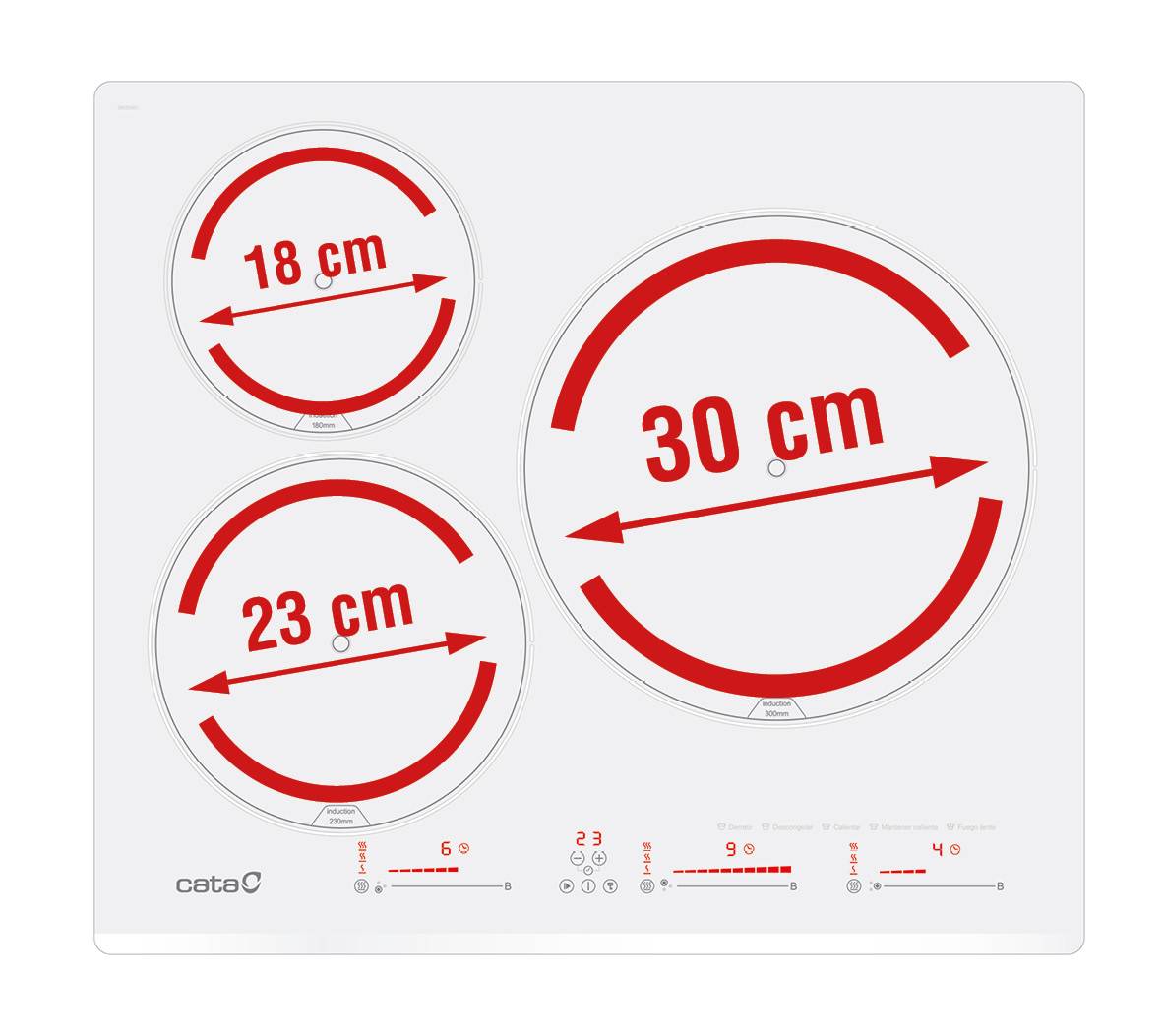 3 Indukciós főzőzóna, MACH2 indukciós technológia, Touch Control érintővezérlés, 9 fokozat, 1 db 30 cm-es, 1 db 23 cm-es és 1 db 18 cm-es főzőzóna, minden főzőzóna BOOSTER funkcióval, 3 főzési funkció: olvasztás (45-55ºC), melegítés, melegen tartás (65-70 ºC), forralás (85-95ºC), gyerekzár, időzítő, maradékhő kijelzés, Quick-Fix system, teljesítmény: 7,1 kW