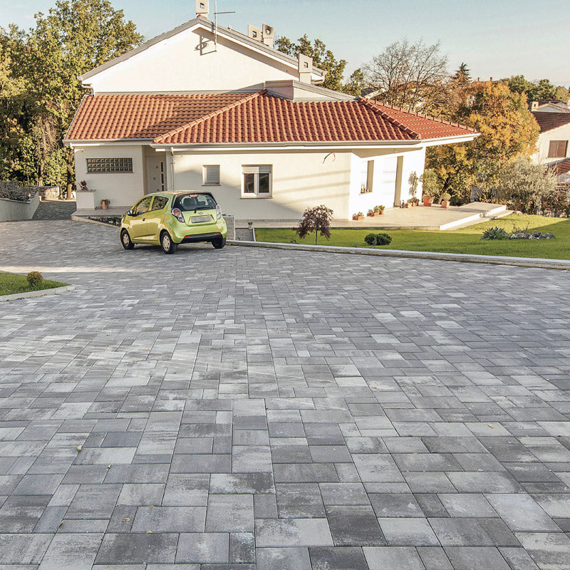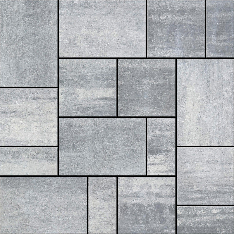 Szürke-fehér színű, modern stílusú, változatos szín- és formavilágú, különleges, melírozott árnyalatban elérhető, kombi térkő, intelligens fugatechnikai rendszerrel, térkő elmozdulás és károsodás nélkül.