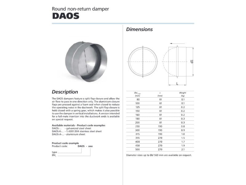 A DAOS visszacsapó szelep egyirányú levegőáramlást tesz lehetővé a légcsatornában. Alkalmazási terület: Szellőző rendszerekhez, légáramlás visszaáramlásának megakadályozásához. A túlnyomásnak kitett alumínium lamellák kinyitnak, majd a rozsdamentes acélrugónak köszönhetően bezárnak, ha a nyomás csökken, vagy megszűnik. Anyaga: Horganyzott acél és alumínium A kör keresztmetszetű visszacsapó csappantyú horganyzott acél házzal, alumínium lamellákkal készül. Légcsatorna hálózatba építhető, megakadályozza a levegő visszaáramlását, ventilátor leállása esetén.