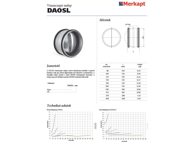 A DAOSL visszacsapó szelep gumitömítéssel egyirányú levegőáramlást tesz lehetővé a légcsatornában. A lamellák teljes zárását a belső EPDM tömítőgyűrű biztosítja.Alkalmazási terület: Szellőző rendszerekhez, légáramlás visszaáramlásának megakadályozásához.A túlnyomásnak kitett alumínium lamellák kinyitnak, majd a rozsdamentes acélrugónak köszönhetően bezárnak, ha a nyomás csökken, vagy megszűnik.Anyaga: Horganyzott acél és alumíniumA kör keresztmetszetű visszacsapó csappantyú horganyzott acél házzal, alumínium lamellákkal készül. Légcsatorna hálózatba építhető, megakadályozza a levegő visszaáramlását, ventilátor leállása esetén.