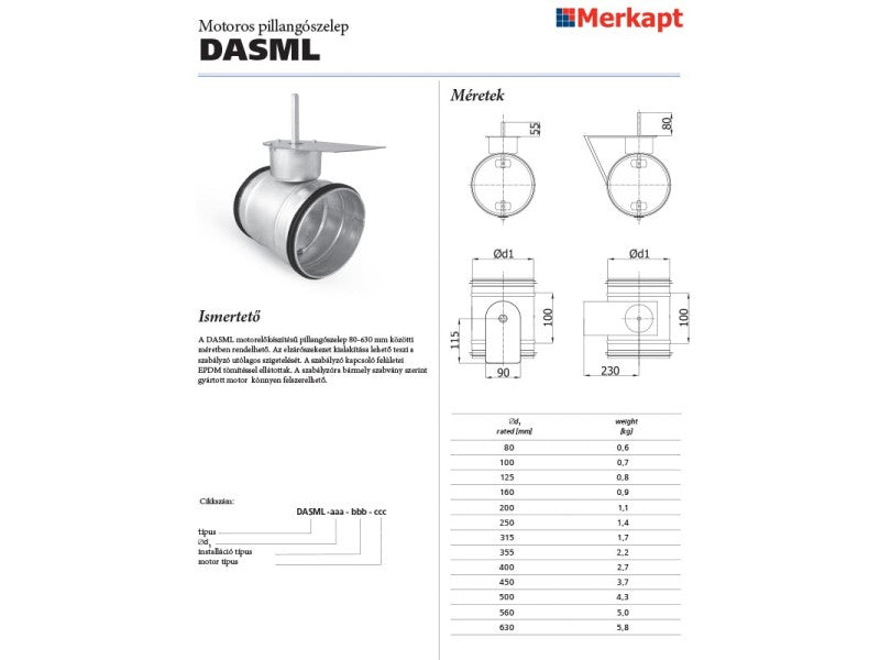 A DASML légtömör motoros mozgatásra alkalmas pillangószelep. Légtömör pillangószelep kézi mozgatással. Ipari szellőztető rendszerek eleme a pontos légmennyiség beállításához. A termék gumi szigetelő gyűrűkkel ellátva. Az állítókar távolsága lehetővé teszi a maximum 50 mm vastag hőszigetelés alkalmazását. Anyaga: Horganyzott acél. Alkalmazása: a légmennyiség pontos beállítására használható, szellőztető rendszerekben