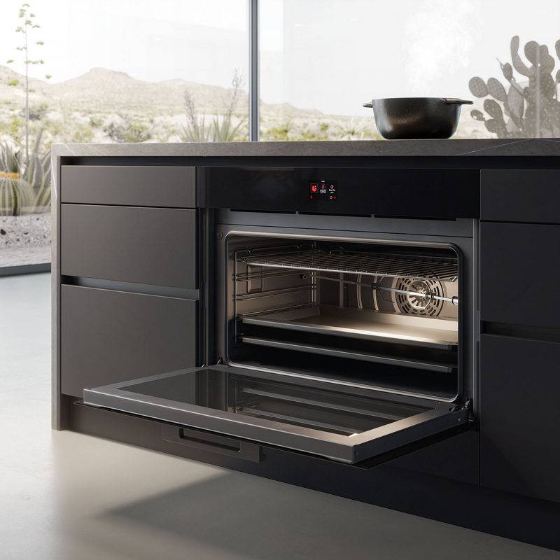 Tágas, vezérelhető, ultra fekete dizájn. Lenyűgöző. 90x60 cm-es sütő színes TFT kijelzővel, könnyen tisztítható és nagyon egyszerűen kezelhető. A teljesen fekete megjelenést fokozza a csiszolt üveg, amely egy olyan tökéletes hőszigetelésű sütőtérrel párosul, amely még a legmagasabb hőmérsékleten (300 C) is képes állandó főzési hőmérsékletet fenntartani. Méretei lehetővé teszik, hogy különböző ételeket főzzön egyszerre, optimalizálva az időt és a fogyasztást. Kondenzátum-szabályozással és szondával is fel van szerelve az edények belső hőmérsékletének ellenőrzésére. 7 évre kiterjesztett garancia. A energiaosztály.