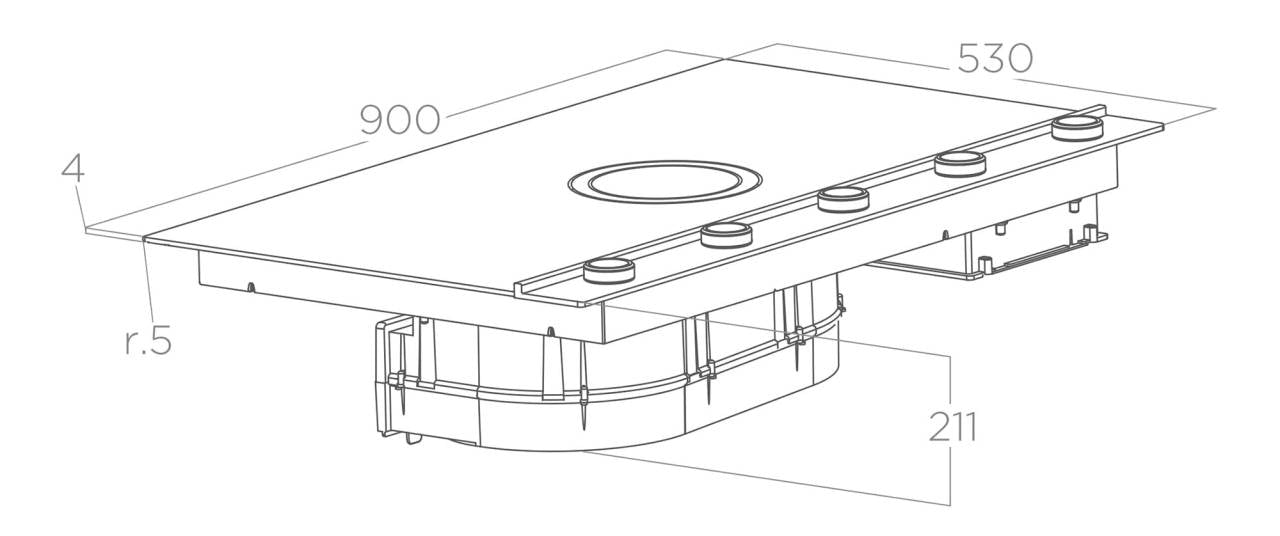 A konyhabútor lábazatából ki. Az EVO választékban lévő modellek mindegyike rendelkezik a jobb oldalán hátul elhelyezett légkivezető nyílással. Ez a készlet lehetővé teszi, hogy a készüléket szűrős (belső keringtetéses) üzemmódban telepítse, és a megtisztított levegőt egy speciális tölcsér alakú csatornával (amely a szellőzőnyílás elegáns díszítésével végződik) a lábazaton keresztül kifelé vezesse.