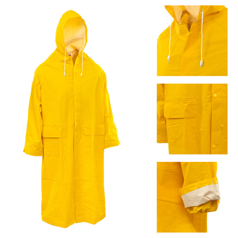Hosszú, sárga színű, patentos PVC esőkabát.