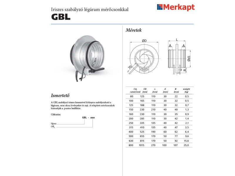 A GBL írisz szabályzó a légcsatornában lévő légnyomás szabályzására szolgál szellőztető és légkondicionáló rendszerekhez. A karral mozgatható írisz lehetővé teszi a légáram finom szabályzását. Az írisz mechanizmus lehetővé teszi a légáram szabályzását, turbulencia zajhatások nélkül. A GBL írisz szabályzó beszerelhető az elszívó ás a kifúvó oldalra egyaránt. Horganyzott acélból készül, a légáram méréséhez nyomásmérő csonkkal ellátott.