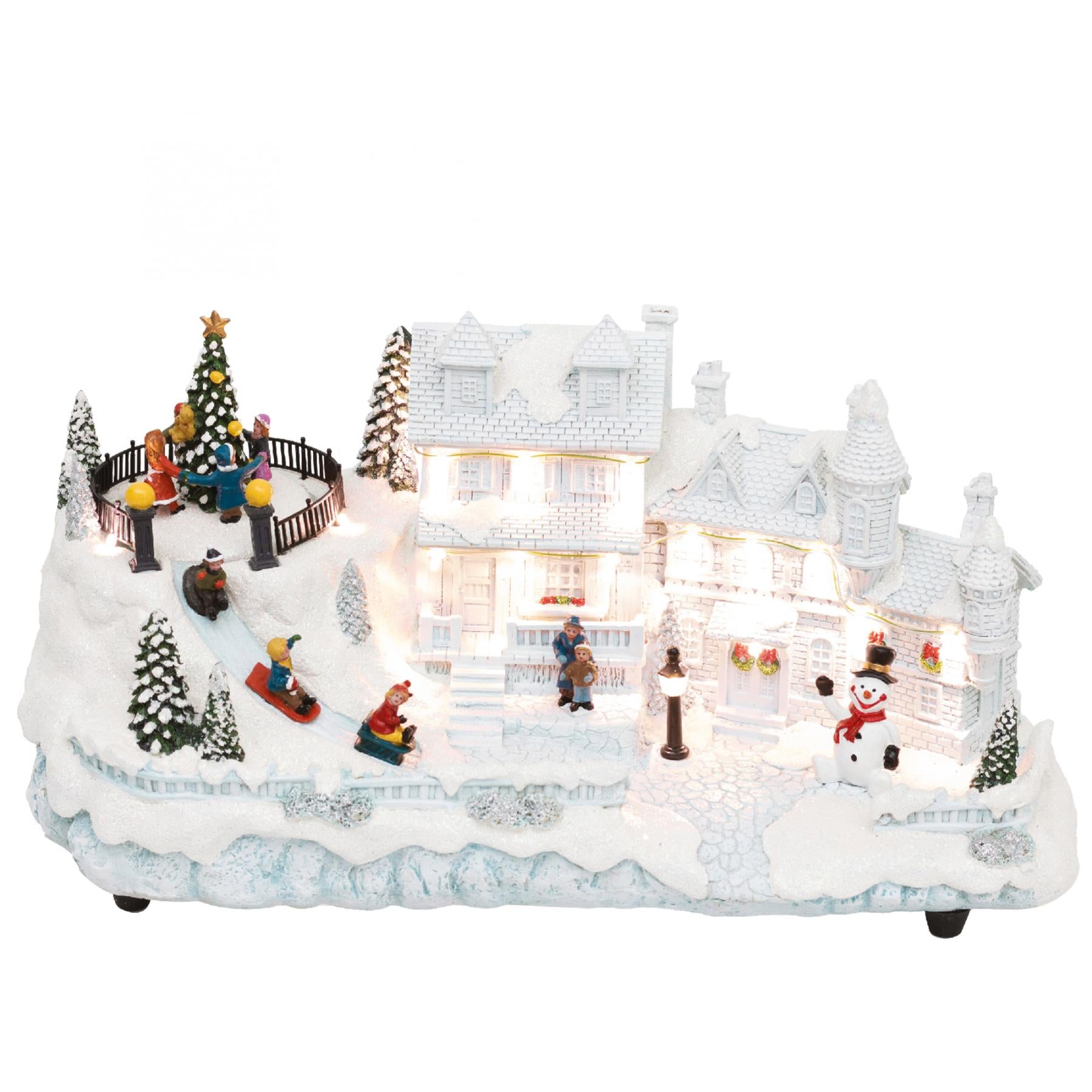 Ez a csodálatos fehér ház beltéri kivitelben készült, bármely szobájában pompázhat. A fehér LED világítás finoman emeli ki a házikó részleteit, míg a forgó fenyőfa varázslatosan életre kelti környezetét. A tápellátást a tartozék beltéri hálózati adapter biztosítja.