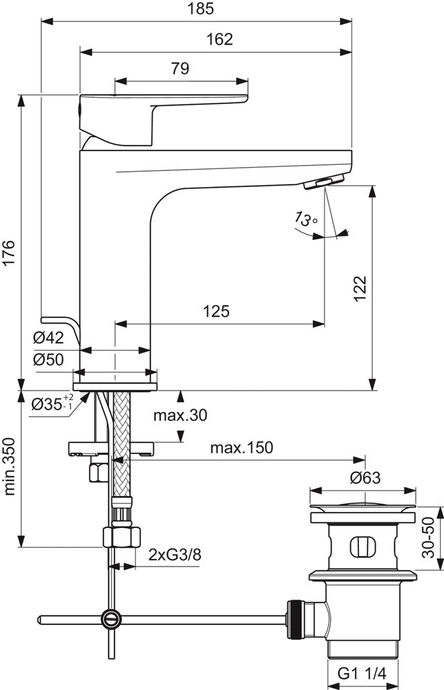 Cerafine O - egylyukú mosdó csaptelep 28 mm-es kerámia kartussal, FirmaFlow-val forró víz korlátozóval, fém lefolyóval, fém fogantyúval piros és kék jelzővel, Perlator aerátorral 5 l/perc átfolyási korlátozóval, díszes rozettával az egységes testrészen, könnyű rögzítő rendszerrel a telepítéshez, és flexibilis csövekkel G3/8”-os vízellátó rendszer csatlakozáshoz.