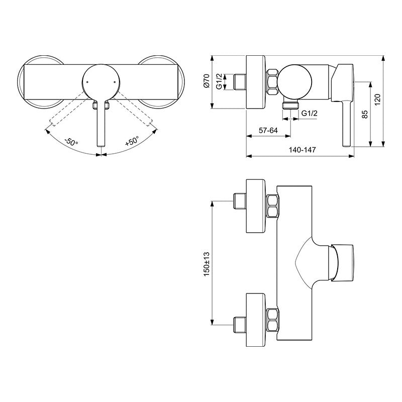 Ceraline falon kívüli zuhanycsaptelep 38 mm-es kerámia kartussal, FirmaFlow forróvíz-határolóval.