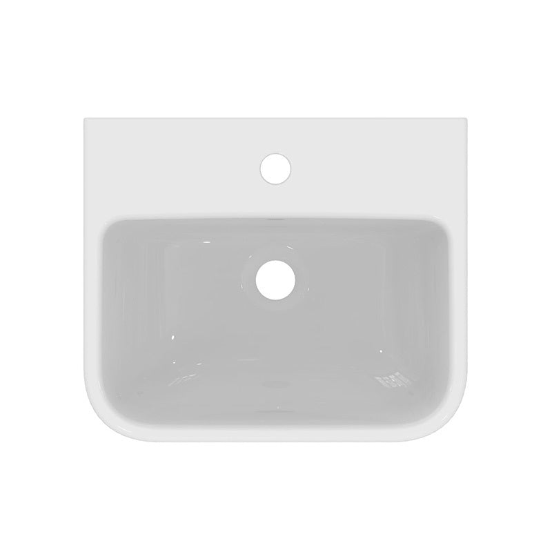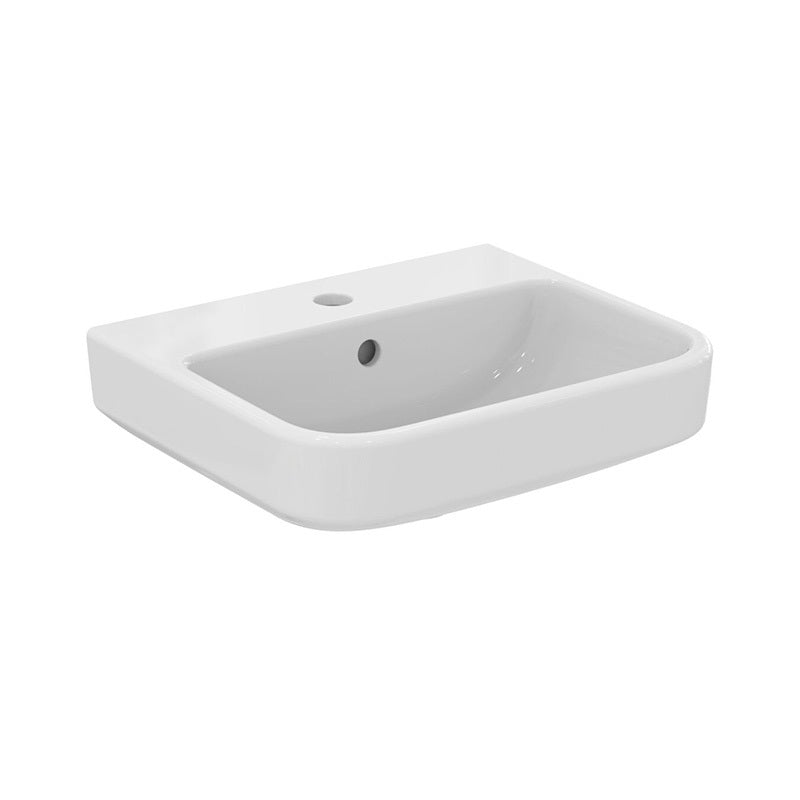 Ideal Standard i.life B kézmosó 45 cm; központi csaprész furattal, túlfolyóval; EN 14688; lábball, szifontakaró lábbal vagy önállóan is felszerelhető szifonnal.