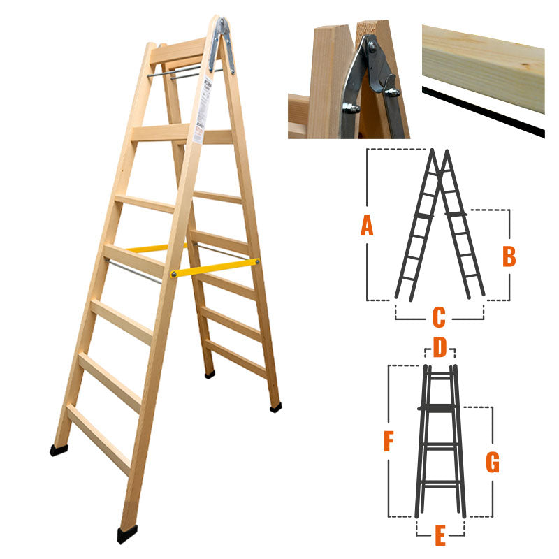 Erős, stabil kivitelű fa festőlétra gyalult, sima felülettel és 1-1 szélesített létrafokkal a biztonságos munkavégzéshez. A fokok alatt elhelyezett merevítőszál növeli a szerkezet szilárdságát, míg a sárga biztonsági heveder megakadályozza a létra túlnyitását. A tetején található vödörakasztó kampó praktikus segítség festéshez és karbantartáshoz.