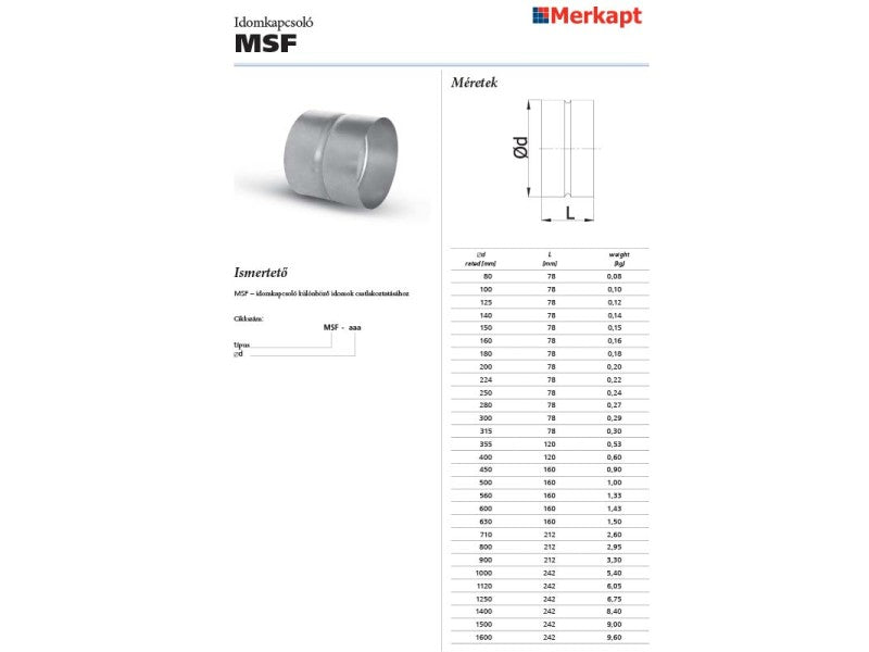 MSF idomkapcsoló, különböző idomok kapcsolásához. Alumínium lemezből készített légtechnikai idom, minden járatos légtechnikai átmérőben. A lemez közepén található mélyedést préseléssel állítják elő, míg az idomok lemezrészeinek összeillesztése forrasztással történik.