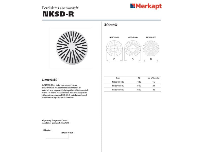 A kör keresztmetszetű perdületes frontlap kis- és középnyomású rendszerekben alkalmazható 4 méter belmagasságig. Alkalmas befúvó- és elszívó rendszerekhez. Könnyen telepíthető a központi csavarral. A PRR-SD-R csatlakozódobozzal kapcsolható a légtechnikai rendszerekhez. Anyag: horganyzott acéllemez.