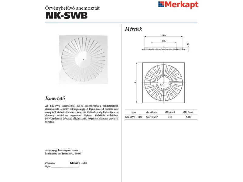 Az NK-SWB kazettás örvénydiffúzort a légáram megfelelő irányára és elosztására tervezték. Alacsony és közepes nyomású befúvó szellőztető rendszerekhez használható legfeljebb 4 méter belmagasságú helyiségekben. A levegő 24 sugárirányban elhelyezett és irányított lapáton keresztül oszlik el. Ennek a diffúzornak az előnye a nagyon jó levegőelosztás és a légáramlás során keletkező alacsony zajszint. Szellőzőcsatornákra szerelhető csatlakozódobozokhoz és álmennyezetekhez. A diffúzor központi rögzítőnyílással rendelkezik. A diffúzorok könnyűek és egyszerűek összeszerelésben, ami szükségtelenné teszi az álmennyezeti szerkezet megerősítését. A PRW csatlakozódoboz használatával egyenletes levegőellátást és csillapítást biztosítunk szigetelt doboz használatával. A rögzítőcsavar nem tartozéka az NK-SWB diffúzornak.
