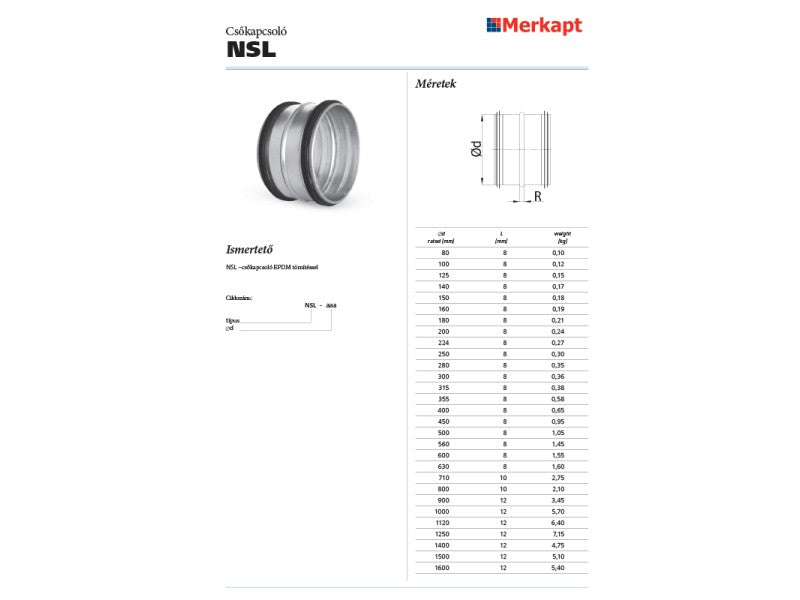 NSL gumis csőkapcsoló, EPDM tömítéssel. Csövek összekapcsolásához. Alumínium lemezből készített légtechnikai idom, minden járatos légtechnikai átmérőben, gumitömítéses kivitelben. A lemez közepén található kidudorodást préseléssel állítják elő, míg az idom lemezrészeinek összeillesztése forrasztással történik.