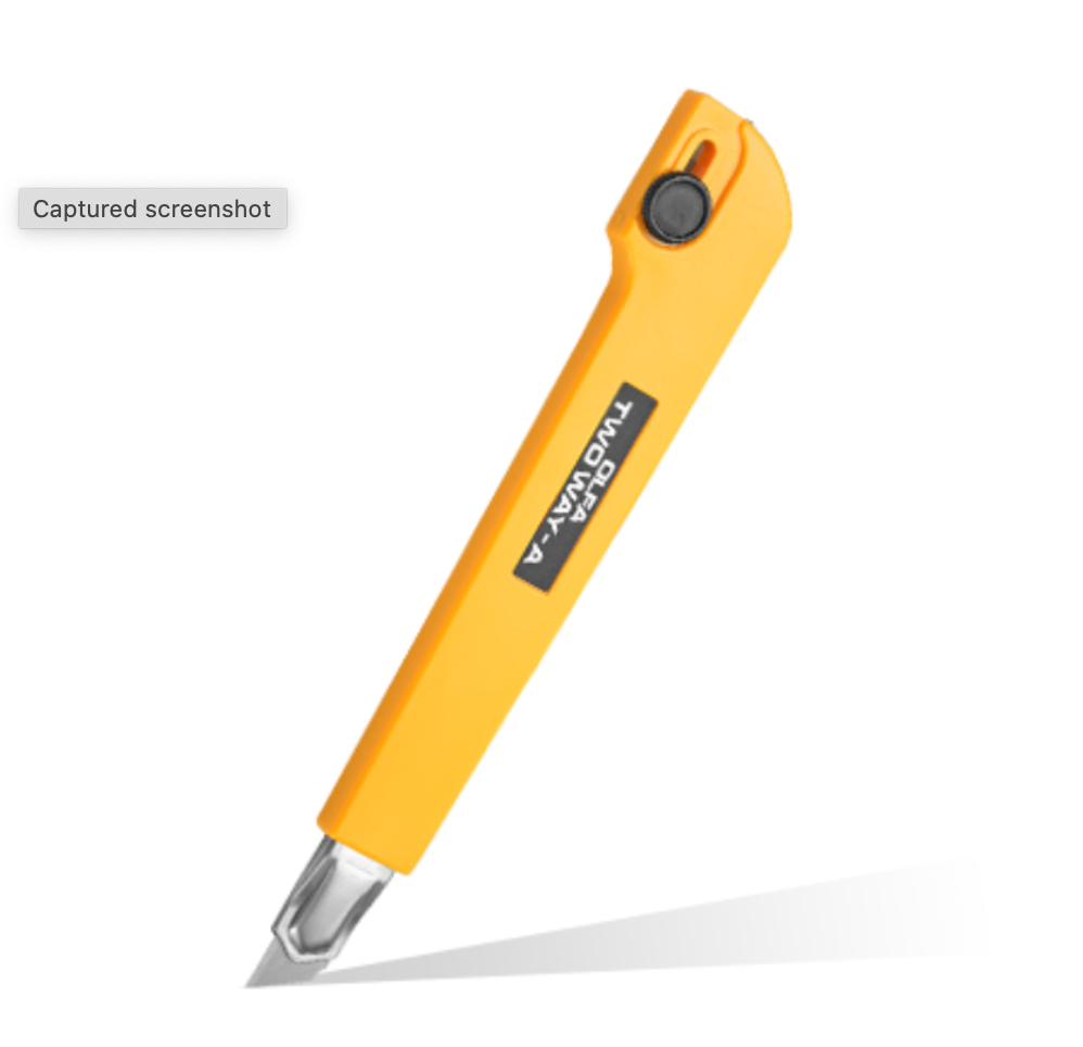 OLFA A-3 9mm-es standard kés / sniccer. Acélházas, automata pengerögzítővel rendelkező vágóeszköz. A markolat végén kialakított speciális tartóba helyezett pengeszelettel, precíz, íves vágásokat is végezhetünk.