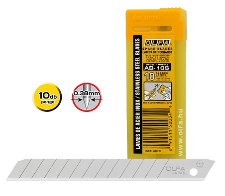 OLFA AB-10S - 9mm-es standard tördelhető rozsdamentes penge. A következő standard késekhez alkalmazható: SPC-1, S, 180 Black, ES-1/green, A-1, A-2, A-3, A-5, 300, NA-1, SVR-1, SVR-2, PA-2 és XA-1