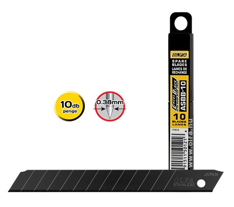 OLFA ASBB-10 - 9mm-es standard tördelhető penge. A következő standard késekhez alkalmazható: SPC-1, S, 180 Black, ES-1/green, A-1, A-2, A-3, A-5, 300, NA-1, SVR-1, SVR-2, PA-2 és XA-1.