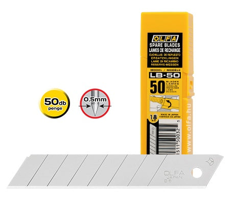 OLFA LB-50 - 18mm-es standard tördelhető penge. A következő standard késekhez alkalmazható: SL-1, BN-L, BN-AL, ML, L-1/green, L-2, XL-2, L-5, L5-AL, L-7, L7-AL, OL, NOL-1, NL-AL, PL-1, CL és CMP-2.