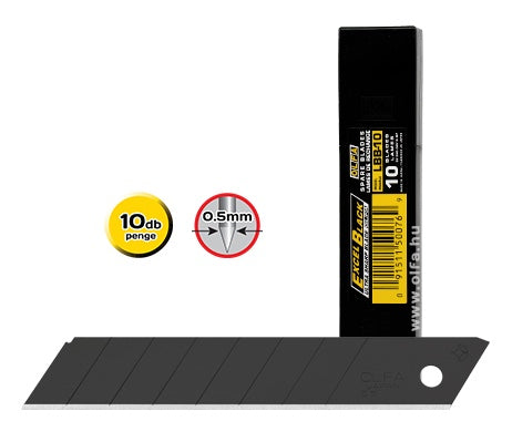 OLFA LBB-10 - 18mm-es keskenyebb élszögű edzett tördelhető penge. A következő standard késekhez alkalmazható: SL-1, BN-L, BN-AL, ML, L-1/green, L-2, XL-2, L-5, L5-AL, L-7, L7-AL, OL, NOL-1, NL-AL, PL-1, CL és CMP-2.