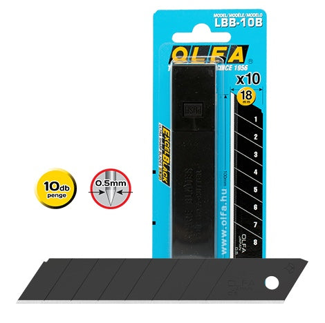 OLFA LBB-10B - 18mm-es keskenyebb élszögű edzett tördelhető penge. A következő standard késekhez alkalmazható: SL-1, BN-L, BN-AL, ML, L-1/green, L-2, XL-2, L-5, L5-AL, L-7, L7-AL, OL, NOL-1, NL-AL, PL-1, CL és CMP-2.