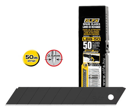 OLFA LBB-50 - 18mm-es keskenyebb élszögű edzett tördelhető penge. A következő standard késekhez alkalmazható: SL-1, BN-L, BN-AL, ML, L-1/green, L-2, XL-2, L-5, L5-AL, L-7, L7-AL, OL, NOL-1, NL-AL, PL-1, CL és CMP-2.