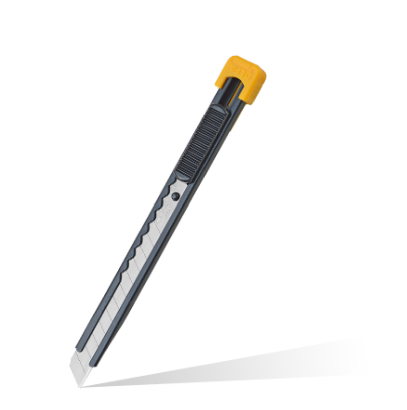 Acél markolatú kés, műanyag pengetörővel. Általános otthoni vagy irodai használatra.