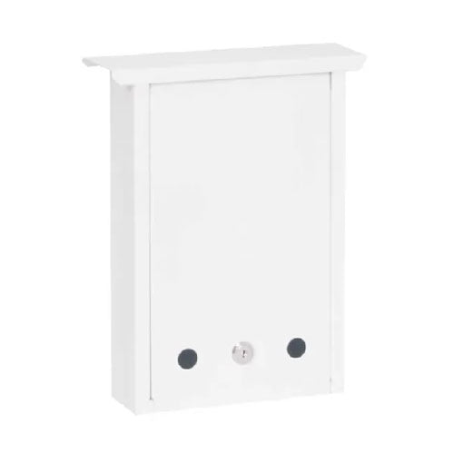 Kerítésre szerelhető, hátsó bedobós, fehér színű, horganyozott lemezből készült postaláda.