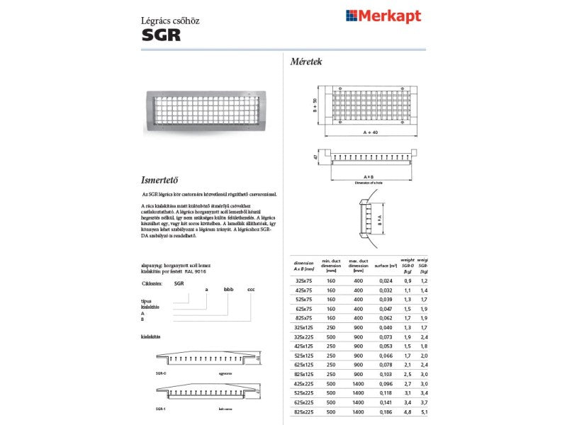 Az SGR acél rács csavarozással közvetlenül rögzíthető kör légcsatornára. A rács kialakítása miatt különböző átmérőjű légcsatornákhoz csatlakoztatható. A rács horganyzott acéllemezből, hegesztés nélkül készül, így nem szükséges külön felületkezelés. Készülhet egy, vagy két soros kivitelben. A lamellák állíthatók, így könnyen lehet szabályozni a légáram irányát. (A rácshoz SGR-DA szabályzó is rendelhető.)