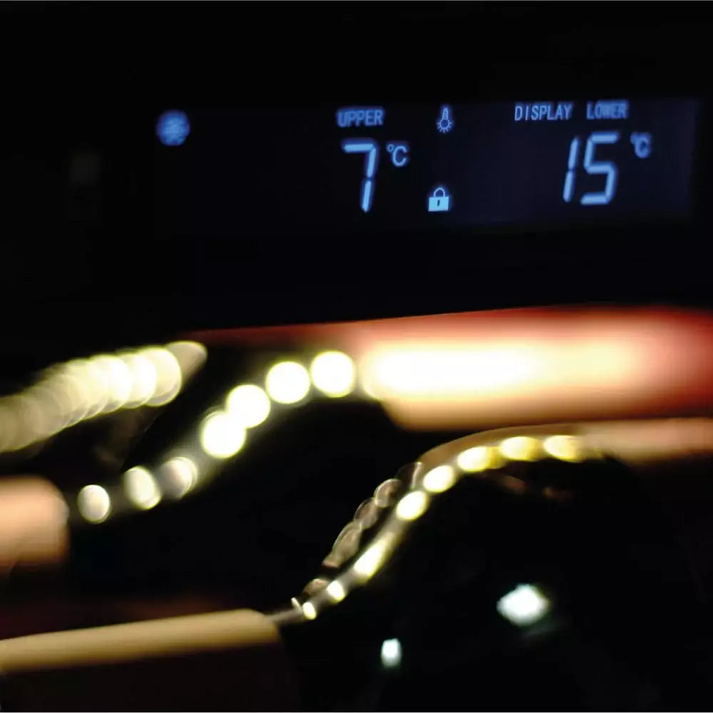 A belső teret 4000°K színhőmérsékletű LED világítás ragyogja be, amely természetes, kellemes fényt biztosít. A világítás intelligens funkciókkal is rendelkezik: a fény bekapcsolható akkor is, ha az ajtó zárva van, de automatikusan felkapcsol, amikor a borhűtő ajtaját kinyitjuk. Ez nemcsak praktikus, hanem elegáns megoldás is, amely minden pillanatban méltó módon emeli ki a palackokat.
