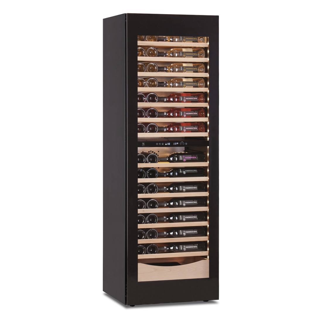 - Az alsó zóna +12 °C és +20 °C között szabályozható, amely a vörösborok tökéletes érlelését biztosítja.