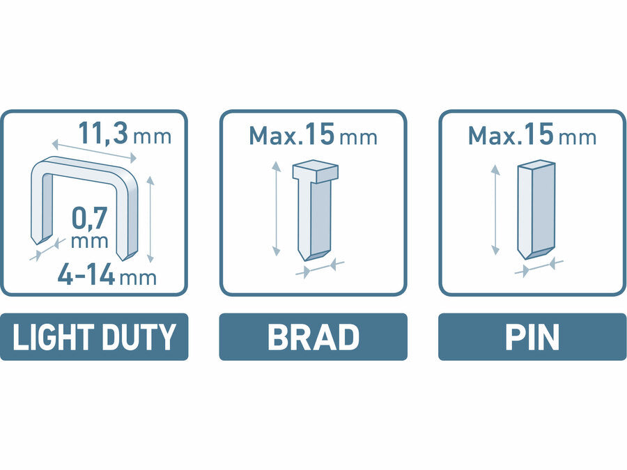 kiegésztítő jellemzők: | az ütés erejének beállítása, kapcsokhoz alkalmas: magasság 4-14mm, távolság 11,3x vastagság 0,75mm, szögek fejjel és fej nélkül, max. 15mm |