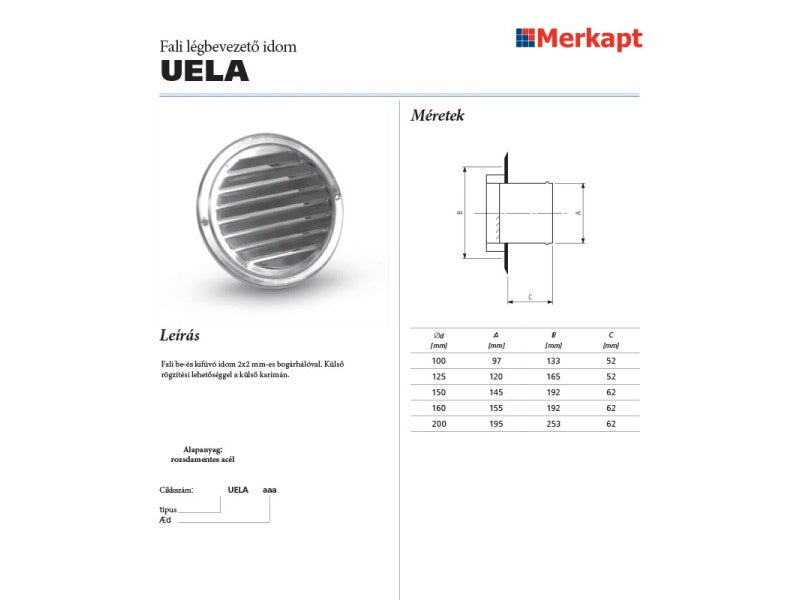 A szellőzőrendszer kerek vége az épületen kívül és belül egyaránt falra szerelhető, amely légbeömlőként vagy levegőkimenetként is funkcionálhat . A kiegészítő háló, amellyel a termék fel van szerelve, védi a telepítést a rovarok ellen, és két rögzítőnyílás megkönnyíti a beszerelést. Az elemet esztétikus megjelenés és kiváló minőségű kidolgozás jellemzi, amit a polírozott rozsdamentes acél használata igazol.