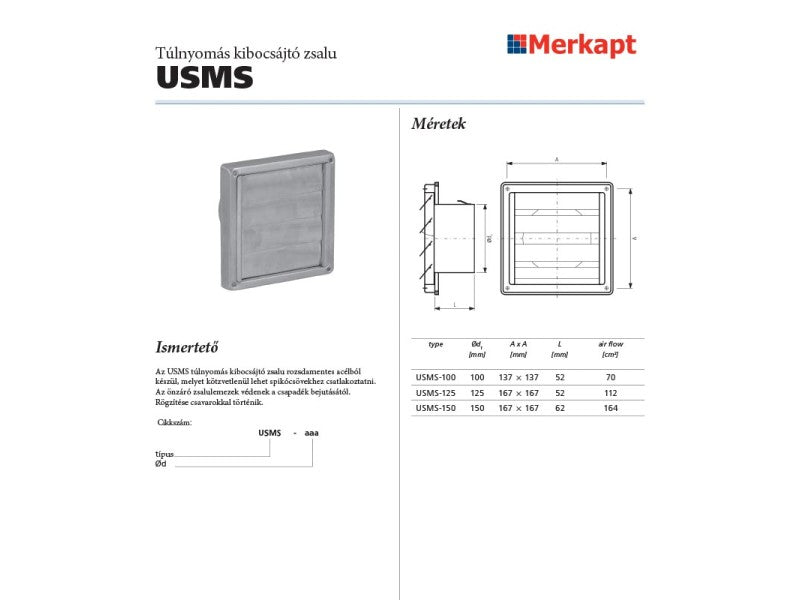 Rozsdamentes acélból készült zsalu, mely túlnyomás kibocsájtására szolgál. Az önzáró lemezek védenek a csapadék bejutásától. Csavarokkal szerelhető.
