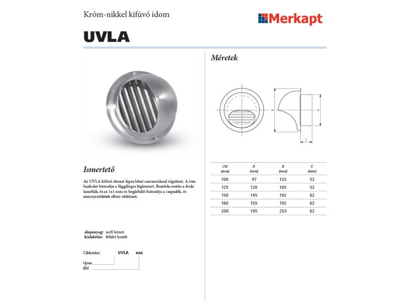 Az UVLA sorozat termékei a gravitációs és gépi szellőztető rendszerek szellőzőcsatornáinak végeként megtalálják a rendeltetésszerű alkalmazásukat, és beváltak a háztartásban és az ipari létesítményekben egyaránt. Csiszolt rozsdamentes acélból készült, amelyek ellenállnak a korróziónak és az időjárási viszonyoknak. A készlet tartalmaz egy gumitömítést, rögzítőcsavarokat és egy kondenzvíz csepegtetőt, amely megakadályozza az épület homlokzatának szennyeződését.